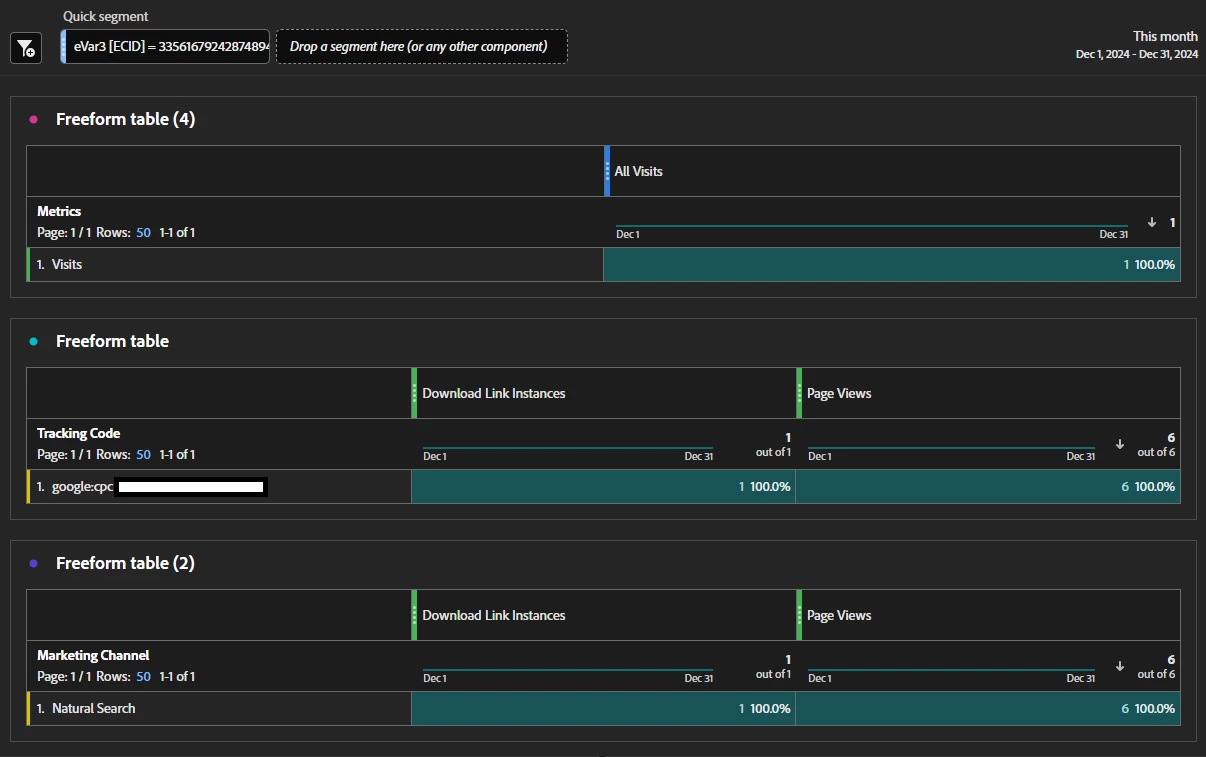 And then we ran another test, where I clicked the ad from a new incognito browser so I would look like a new user and noted down the ecid for the user. But the visit still ends up in the Natural Search channel. I segmented by the ecid here so this should be my specific test visit: