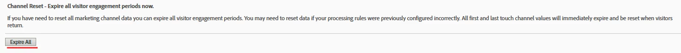 If you have need to reset all marketing channel data you can expire all visitor engagement periods. You may need to reset data if your processing rules were previously configured incorrectly. All first and last touch channel values will immediately expire and be reset when visitors return.