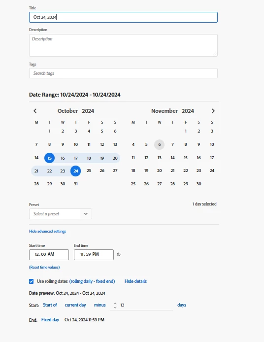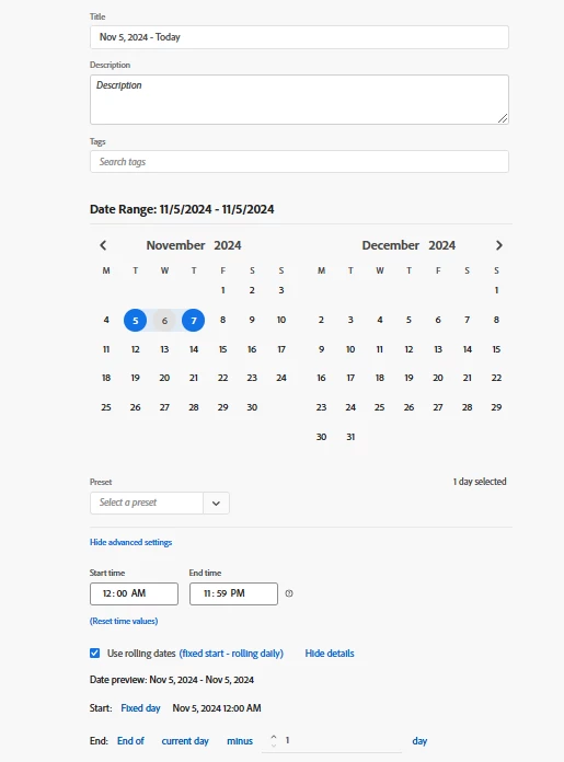 Is there a way to do a rolling pre/post time window to a given date? For Example, If I start a test Nov 1, I'd want my dates to be 5 in front (Nov 5.) and 5 behind (Oct 26). Can it roll forward and backwards?