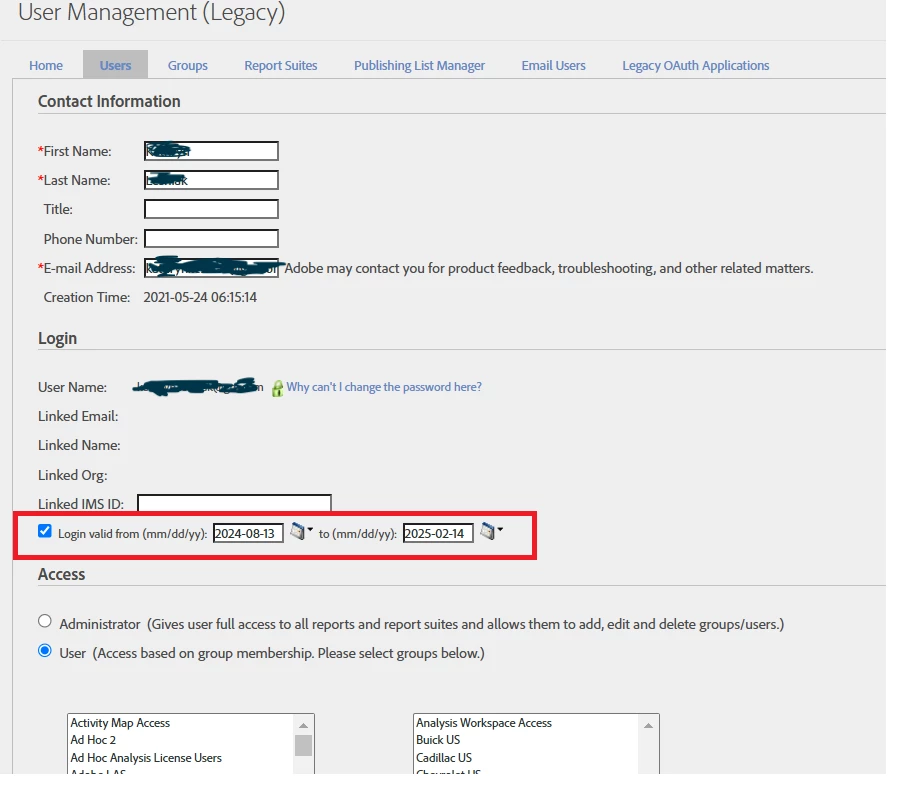 In the Omniture Legacy UI, there is an option to expire a user after a set amount of days (see screenshot). It would be helpful to be able to utilize the same functionality within the Admin Console, specifically Adobe Analytics, to ensure that external users are expired after a certain number of days (ideally 6 months), but ONLY if they haven't had any activity in the last 6 months.