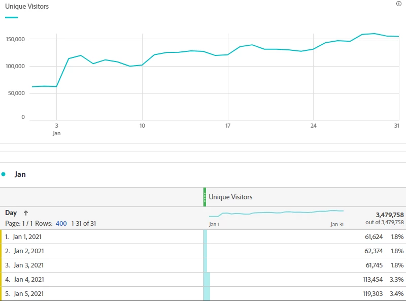 Below an example of a trended report showing Unique Visitors for a site section. Looking at the trend, you can easily see the Visitors increased starting Jan 3 and progressively thereafter.