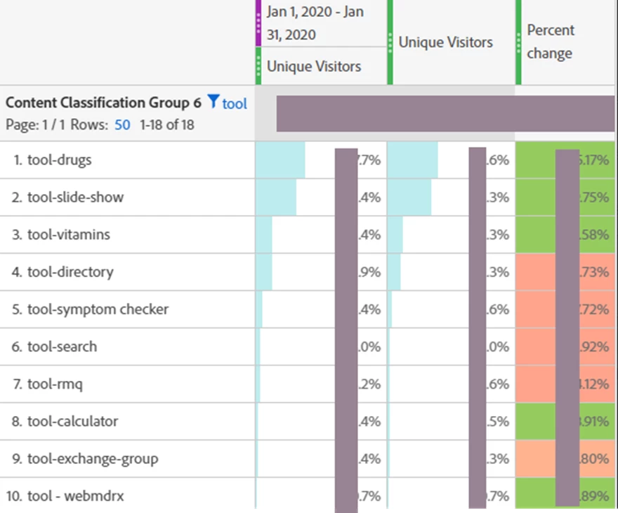 Contribution can also help you know where to invest resources and attention. For example, you may have a topic such as “Gerd” that generates very high page consumption. However, it contributes only a very small portion of your sites page views compared to other topics such as “Cancer” or “Flu”. Once identified, you can then look at the growth potential of Gerd and decide whether to spend dollars promoting it or whether the current Gerd dollars are better spent improving your high value Cancer section.