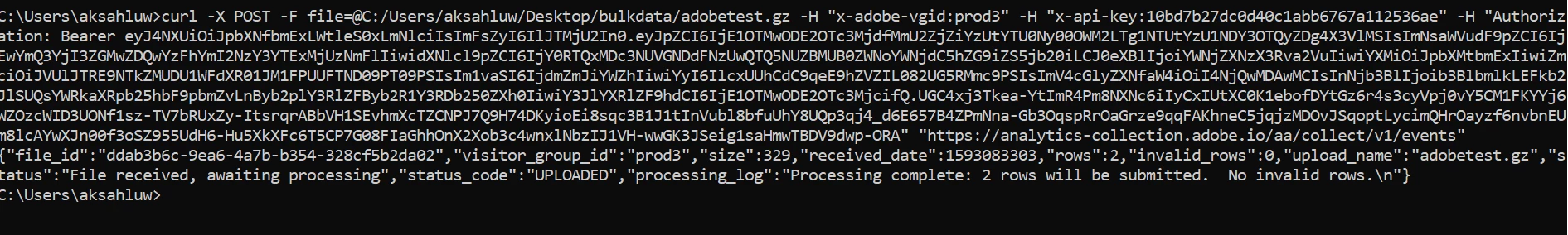 I am using my sandbox Adobe Analytics report suite, to upload server calls using the bulk data insertion API. I was successfully able to upload my compressed batch file (csv columns format) using curl command on windows terminal. Also, I got successful response in terminal saying input rows processed and uploaded successfully. After successfully uploading and waiting for 2 days, I still do not see any data in my report suite, event page names is not being captured. I am attaching my batch file and screenshot from my terminal. I am not sure why the data is not being reported in Adobe Analytics reports. If anyone could provide their thoughts here would be really helpful.