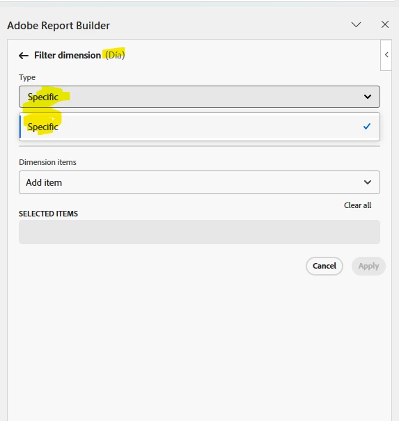 For some dimensions, I can filter using the "Most popular" filter and choose the number of rows I want to display. But in other cases, when I try to filter a dimension, I only get the "specific" option, and I'm not able to filter by the number of rows.