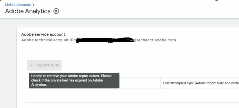 I am trying to link Adobe Analytics with SA360 per Google documentation https://support.google.com/searchads/answer/7669521?hl=en using JWT authentication method. I have the admin access in Adobe Analytics and sufficient permissions on SA360. The issue is, the link never completes. I am getting the error "Unable retrieve your Adobe report suites. Please check if the private key has expired on Adobe Analytics." when I have newly generated the public private key pair in Adobe developer console.