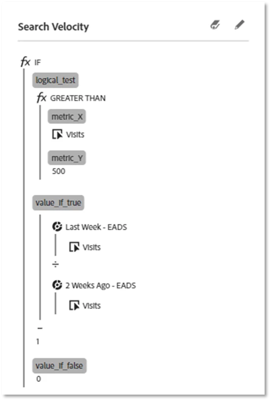 In order to build this, you’re going to create a calculated metric. First, you need to use the “if” function. In the logical test of the “if”, place the “greater than” function. Here is where you’re going to set your threshold (example, 500 visits associated with the search term). Then the next part of the “if” function is the value if true. Here you are going to create the comparison. You want to have two date range segments, one for your current time period and one for your previous time period. In our example, we used last week and two weeks ago. Divide the current period by the previous period, and then you’re going to subtract 1 (using the constant number option). In value if false, you’re going to put 0. This means that if there are less than 500 visits, instead of doing the calculation, it will just return 0, ensuring that the search term is at the bottom of the list.
