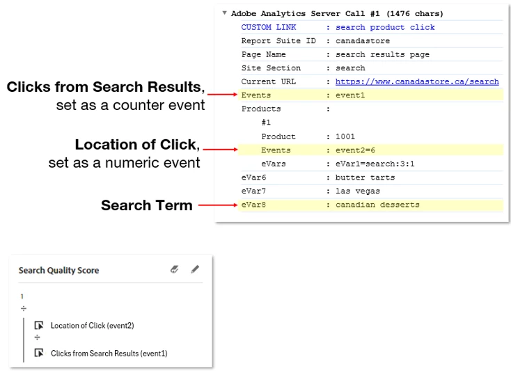 The second metric that we talked about was search quality score. This gives an idea of how well your search results are performing. It is the inverse of the average click position. For example, if your average click location of the product interactions after a search is the 4th item, you take the inverse, ¼, or 25%. The closer your metric is to 100%, the better your search results are performing. This can also be built within workspace, but requires a three important pieces of tracking. The first is a counter event associated with your search, so it increases by 1 every time a search happens. The second is a numeric event that captures the location of the clicked item. For example, if a customer clicks on the 6th result, it returns 6. The third is an evar (or prop) to capture your search term.