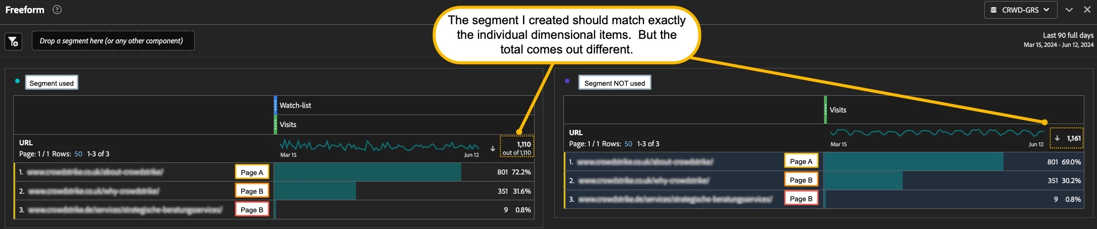 - I applied that segment to a table, and dropped the URL dimension and could see my expected URL's, their visit numbers, and the total for the table.