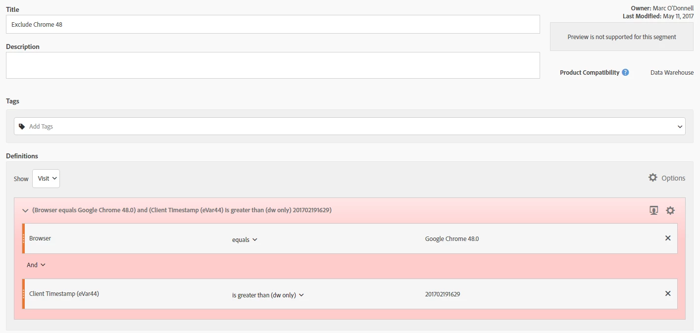 Your segment only works in Data Warehouse (as the definition also states). If you want to create something that works, you will have to define a segment same style as attached...