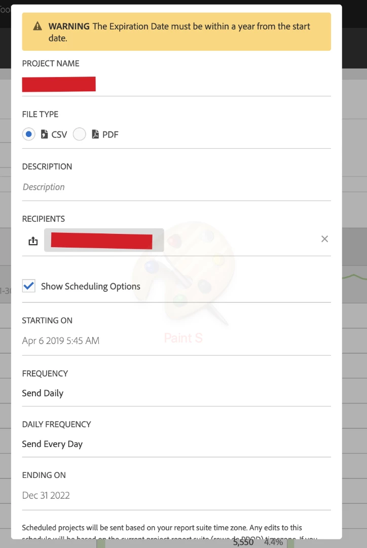 In the documentation it reads: "Scheduled Projects Manager, you can edit and delete recurring project deliveries. You can create delivery schedules that send your reports via email to a specified address. You can configure these schedules to automatically send the reports at specified intervals for a duration of time or indefinitely, or stop the delivery of a recurring project." (Scheduled Projects Manager )