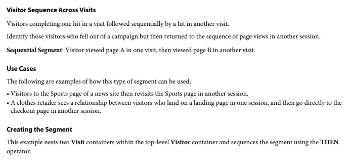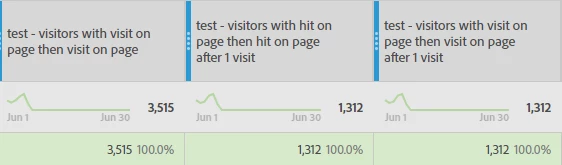 I have been trying for some time now to build a sequential segment that would accurately show the volume of visitors that saw page A in one visit then returned to page A in different visit. The goal being the show the visitor return rate to a page/group of page.