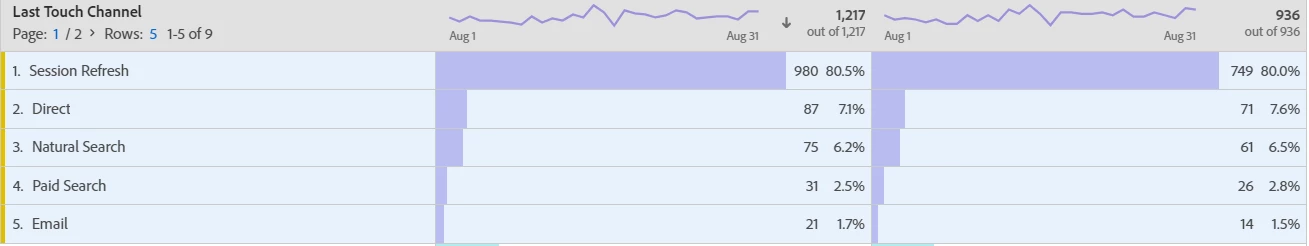 The page is captured in the 'Page Not Found' metric when using the marketing channel to check the source. 'Session Refresh' shows high for the page that lands on a 404 error. The page is not deleted but is redirected to a 404 page.