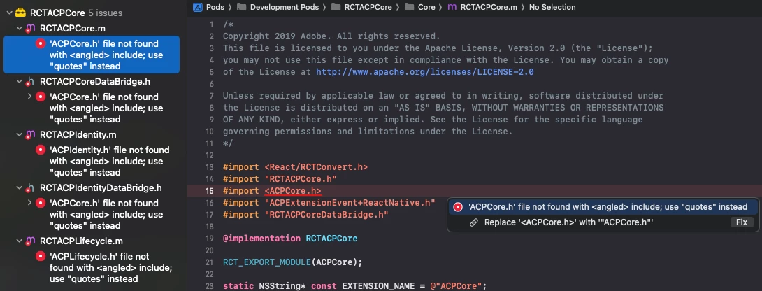 Issue : After installed the react-native-acpcore version 2.0.0 in React Native application, the iOS app is showing the below error when I try to build the app.
