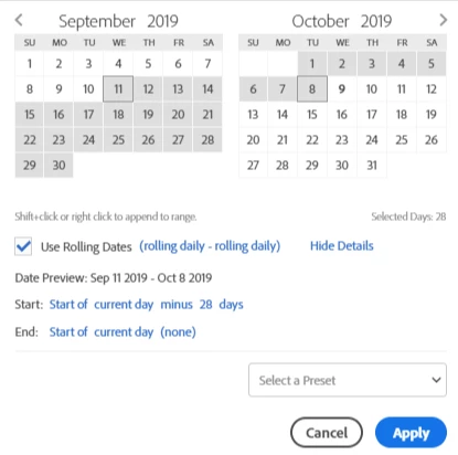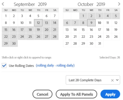 time range "last 30 complete days" or "last 28 full days"