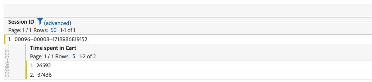 I want something like -- 76254353 (session id) -- 54000 (time spent in cart)