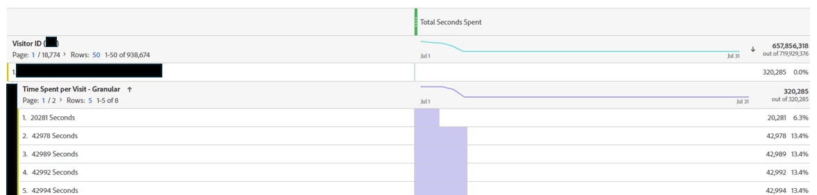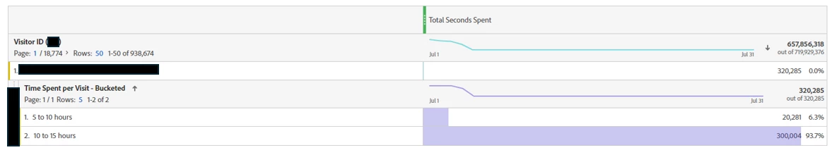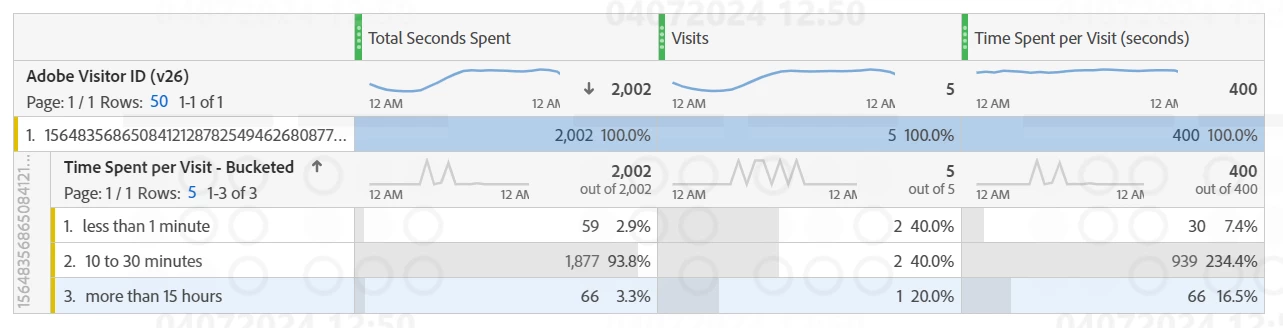 Any idea why a particular visit identified by adobe ID is falling under the time spent per visit bucket for more than 15 hours when the total time spent is only 66s.