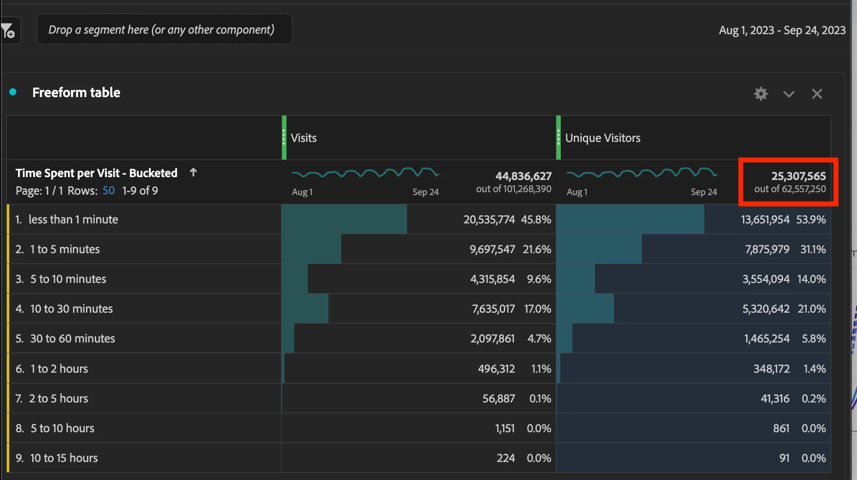 I am trying to calculate time spent per visitor. Currently the time spent per visit - bucketed dimension is at a visit level only. If I use unique visitors as a metric, it totals to over what is shown in the column total - see screenshot: