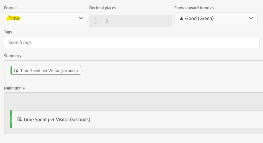 If you want it to display as a readable time, you can just create a calculated metric like so: