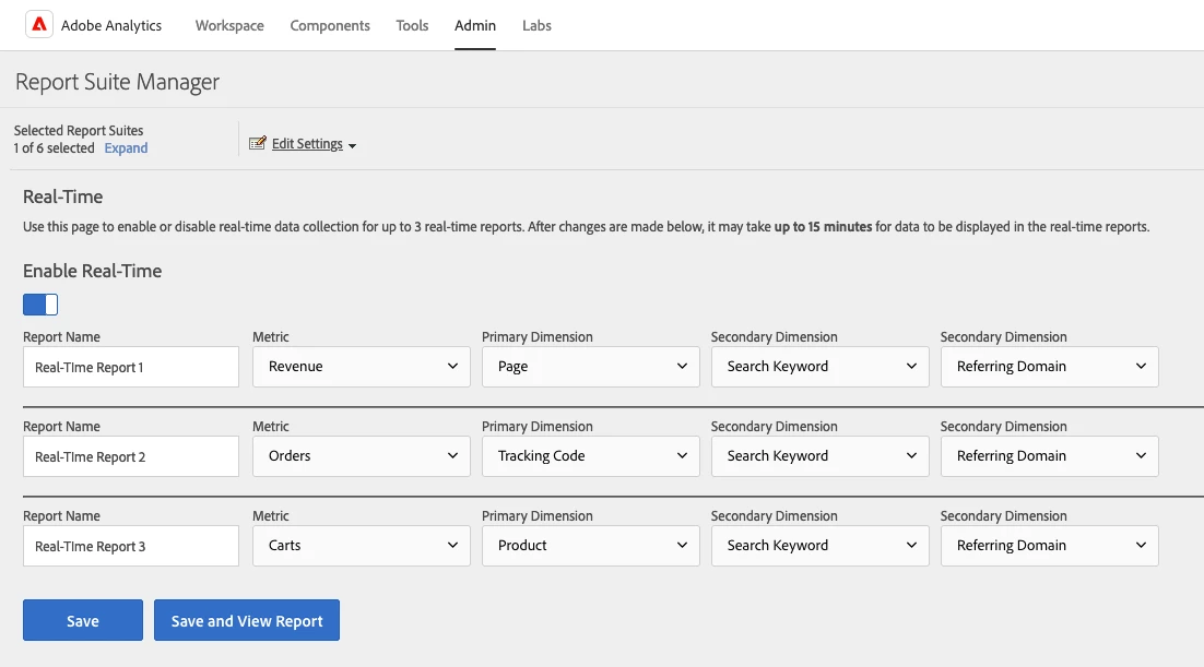 Navigation: Analytics > Admin > Report Suites > Select a Report Suite > Edit Settings > Real-Time > Save or Save and View Report