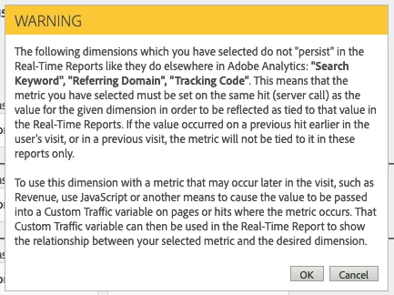 - Some dimensions do not persist in real-time, if you select a non-persistent metric, you will see the below warning