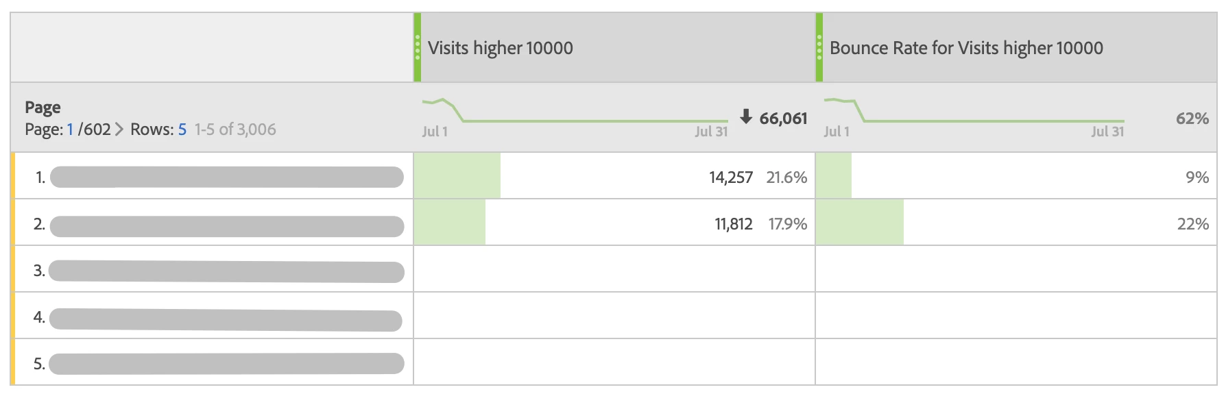 Hello! I am trying to get a list of all our pages that meets two requirements: has 100k+ visits AND and then sort by bounce rate. I can't figure out how to do this in Workspace but assume it's a fairly easy thing to do? I want to avoid exporting and manually sorting the info.