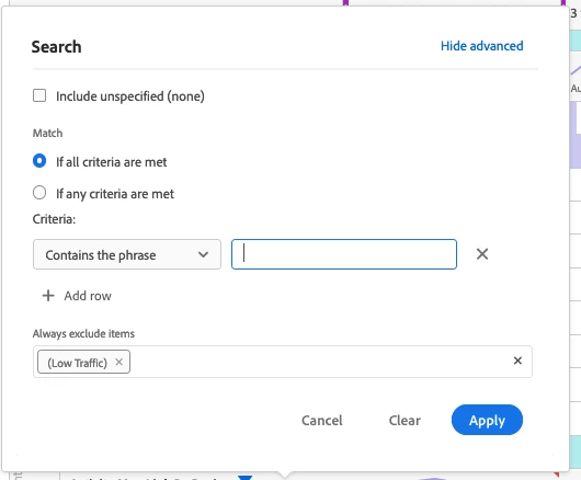 Until this past week, we were able to filter out the "(Low Traffic)" item from data tables by using the "Always Exclude" field in the advanced search mode of the filter option. Now Workspace returns an error saying "One of the segments or the search in this visualization contains a text search that returned too many results. Please narrow the text search criteria and try again."