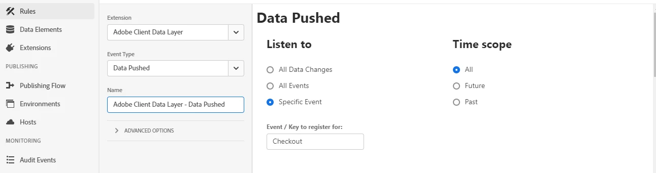Also, could you put on debugging using _satellite.setDebug(true); on the console and then check what happens when you push the object in the datalayer.