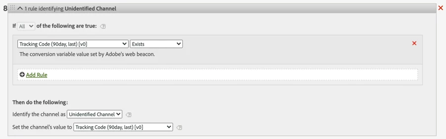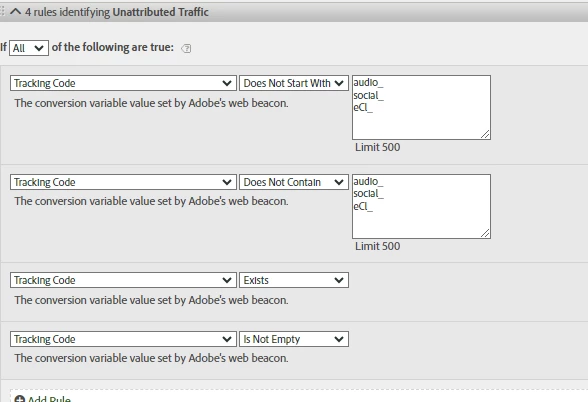 Long-time lurker, first-time poster to this community.  I've seen similar questions to this one but they didn't quite answer the issue so just sharing some nuances to pinpoint the issue.  We recently added 2 new marketing channels and processing rules to our global suite Marketing Channels, under our admin settings.  After that, unrelated, our "other campaign/unattributed" channel started collecting tracking codes that were not a part of the rule set for that channel.  We've been steadily adding to the ruleset for "other campaign/unattributed" to stop attribution to that channel but we're still  seeing a ton of "unspecified" traffic so that it's our most visited source, according to reporting and I don't think that's right yet.  Other campaigns/unattributed has never been our highest attributed channel.  According to our rule set, unattributed/other campaigns should be last in the processing order, so I'm not sure why there is still so much traffic for "other campaigns/unattributed." Have also split the rules into two to hopefully clean it up more.  Have included screenshots of some of the environment