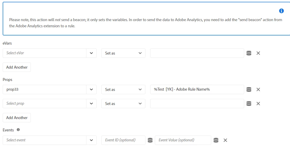 The rule was configured to capture rule names on an unconfigured prop for testing purposes. The rule event was set to "page bottom" and there were no conditions on the rule.