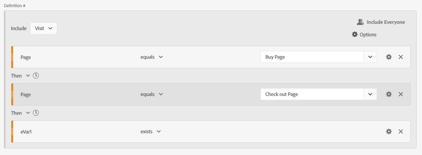 I made a segment that looks for visits that go to the buy page ->(then) checkout page ->(then) evar(button click).