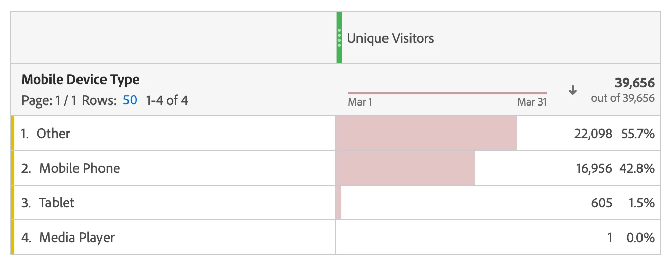 The ‘Unique devices’ metric is a Cross-device analytics metric that counts the number of unique unidentified devices and unique virtual devices. Unidentified devices are devices that generated anonymous hits. Unique virtual devices are distinct people identified per device. This 'Unique Devices' is not an out-of-the box metrics.