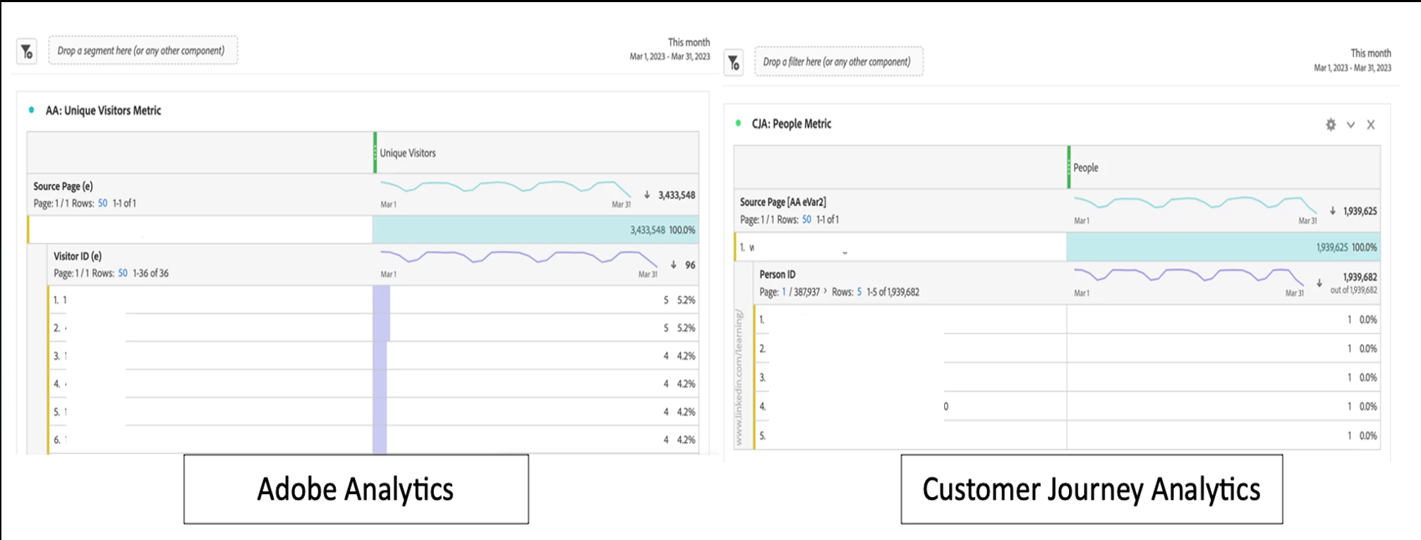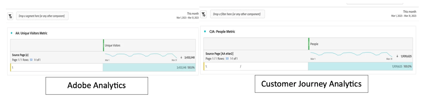 For instance, when analyzing an identical in AA versus CJA for the same date range, we see distinctly different values in the count of Unique Visitors versus People, as shown below:
