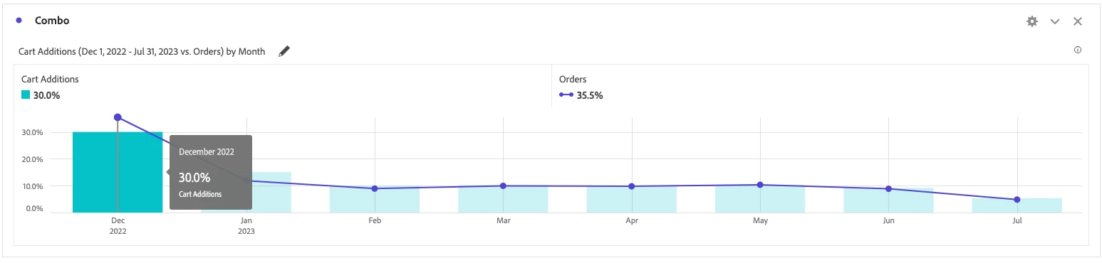 5. Click on the “Gear” icon and navigate to > Settings > General > Percentages. Select the “Percentages” box to switch the chart to percentages instead of the actual values. The graph will now show the portion of the whole for each month. For instance, based on the screenshot below, we see that 30% of Cart Additions made over the last eight months happened in December 2022: