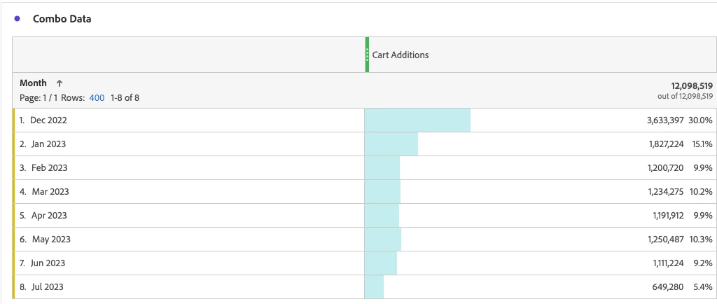 6. We can arrive at the 30% shown above by taking the number of Cart Additions in December 2022 and dividing it by the total number of Cart Additions over the last eight months, which is 12,098,519, as shown in the Freeform table below: