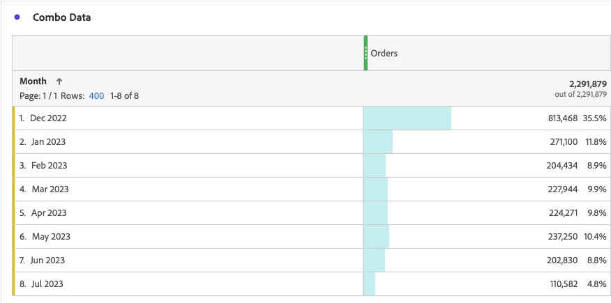 8. As a result, we can take the Cart Additions and Orders percentage from each month to more easily compare how both metrics are trending over time to understand how Cart Additions translate into Orders.