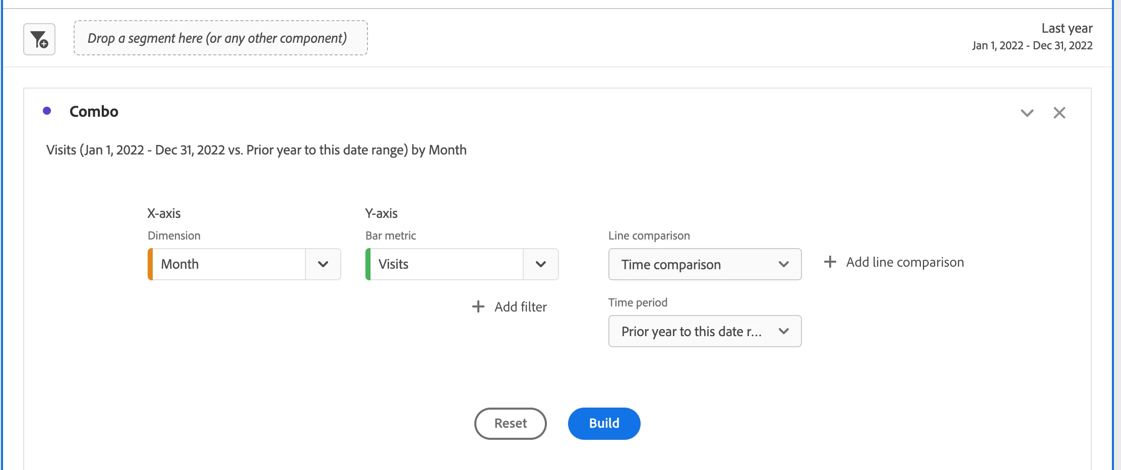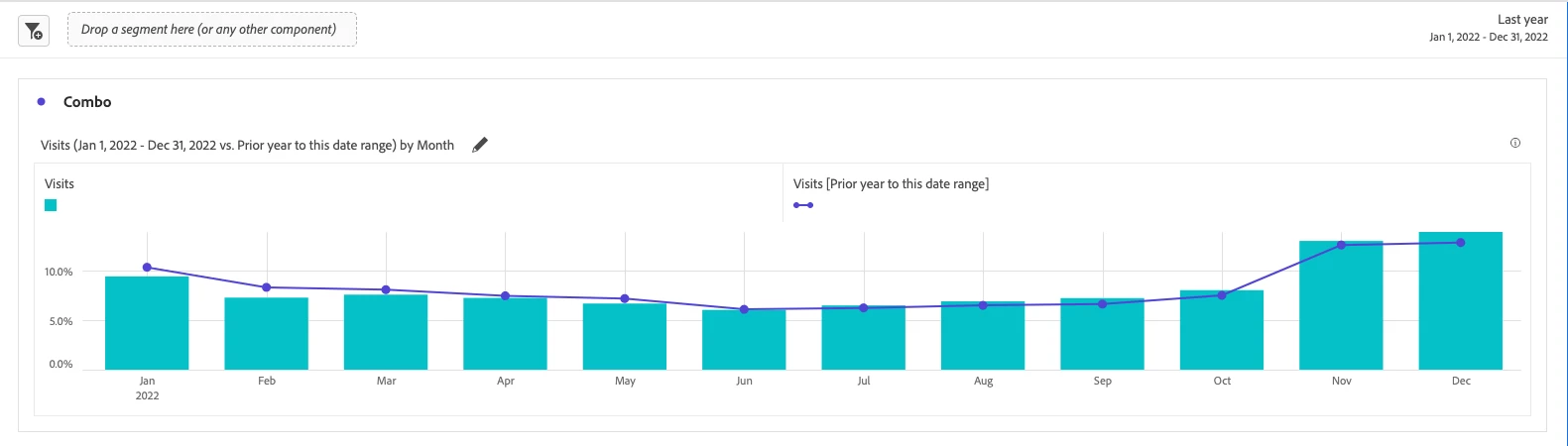 - Under the “Line Comparison” drop-down, select “Time Comparison.” This line comparison pulls data based on the date range you use, so be sure to adjust it appropriately. In this case, we will set our panel date range to “Last Year.” As a result, Workspace will automatically give you the option to compare data from the “Last Year” to the “Prior year to this date range.” The option to create a custom date range to the current one is also available. The resulting Combo Chart will appear similar to the below example: