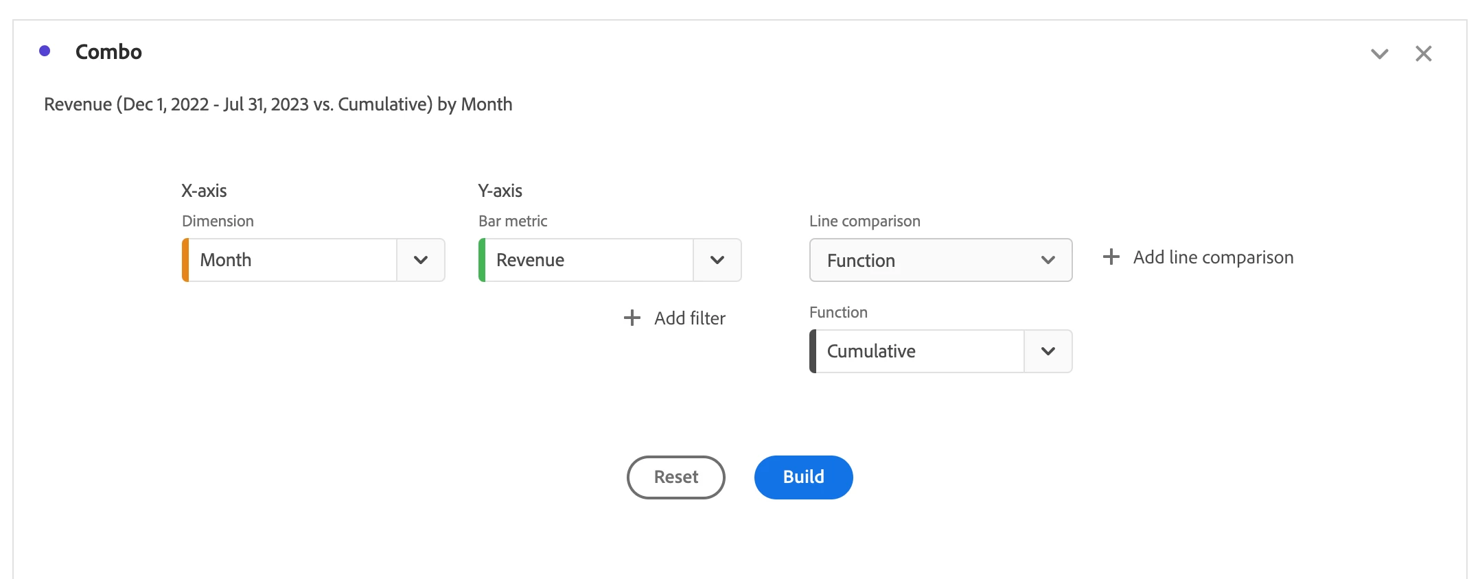 - Under the “Line Comparison” drop-down, select “Function.” Here, you can choose from functions such as Mean, Cumulative, Cumulative Average, Median, etc. In this example, we will create a chart using the Cumulative function, which will display monthly sales & cumulative sales, as shown below:
