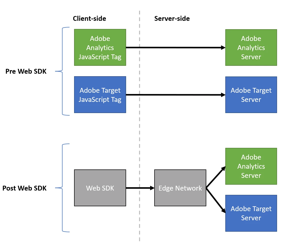 First a bit of background; with Web SDK we are moving away from point-to-point solutions e.g. Adobe Analytics JavaScript sending data to an Adobe Analytics server, Adobe Target JavaScript sending data to an Adobe Target server etc. Instead, we have a single JavaScript tag (Web SDK) communicating with an Adobe Edge Network Server. The Edge Network then forwards data server-side to the various Adobe solutions.