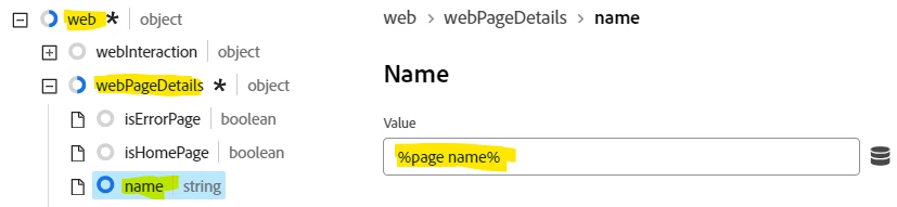Next, we need to provide a page name value. To do this expand out the 'web > webPageDetails' branch and under 'name' map your Data Element that contains your page name value as per the screen shot below. Note: you can reference a Data Element as you do in other parts of the tool, by wrapping the Data Element name in percent symbols e.g. %page name%