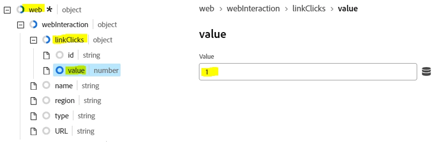 Expand out the 'web > webPageDetails > webInteraction > linkClicks' branch and under 'value' enter a value of '1' as shown in the screen shot below. This value tells Adobe that we are recording a link tracking interaction (rather than a page view).