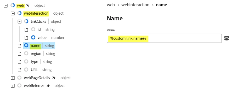 Next, we need to provide a link name value - this is the value that will appear in the Custom Link variables in Adobe Analytics. To do this expand out the 'web > webPageDetails > webInteraction > name' branch and under 'name' map your Data Element that contains your custom link name value as per the screen shot below (again, percent symbols can be used to reference the Data Element name).