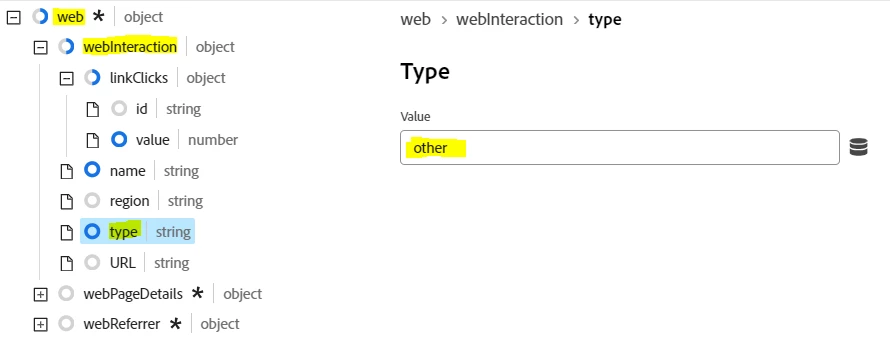Lastly, we need to tell Adobe what type of link tracking we are doing ('other', 'download', or 'exit'). To do this expand out the 'web > webPageDetails > webInteraction > type' branch and enter the appropriate value (normally 'other').