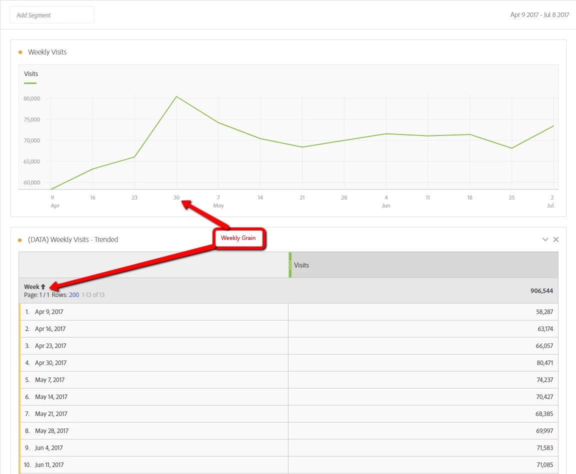 To do so, I created a simple free-form table with the "Week" dimension and then chosen whatever metric I'm interested in (e.g., Visits, Conversion, etc.). From there, I create the visualization (right-click in the data table and choose Visualize). This previously gave me a visualization that aligned to whatever time-based aggregation I chose, but not anymore. If I wanted a daily grain in the visualization, I'd use the "Day" dimension in the data table.... Did something change in Workspace or have I simply lost my mind?