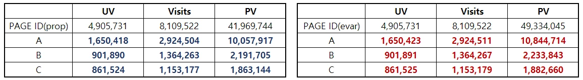 The Page Views, Visits, and Unique Visitors values of Prop and eVar are different.