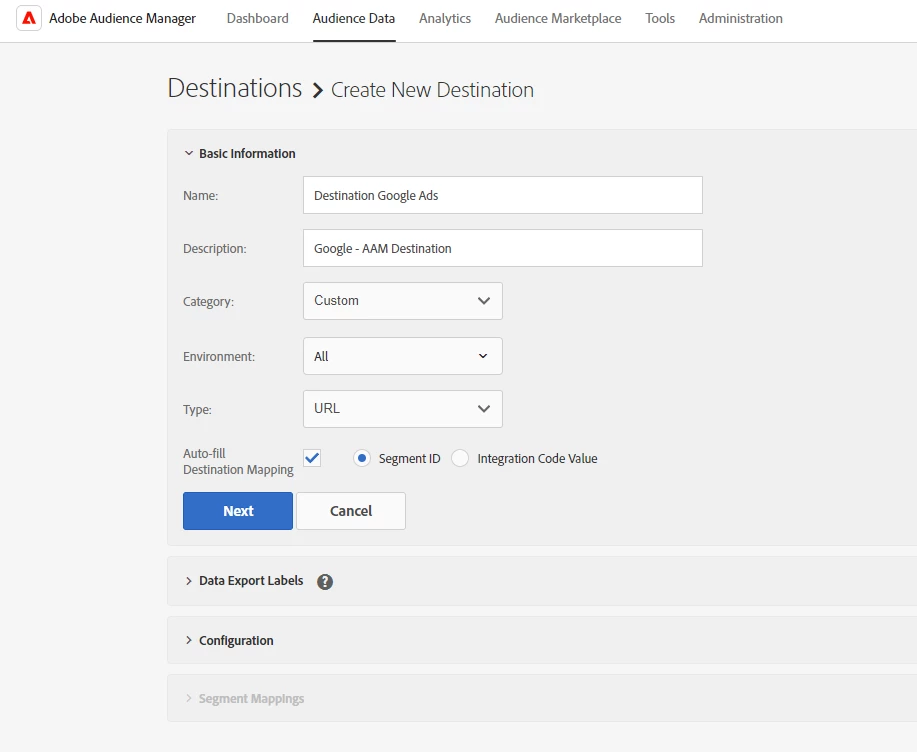 Now, I think I have to create a specific destination towards Google Ads (see the attached screen 192200), but I am unable to understand if this steps are correct or not. I use an "auto fill destination mapping" with segment ID in this case.