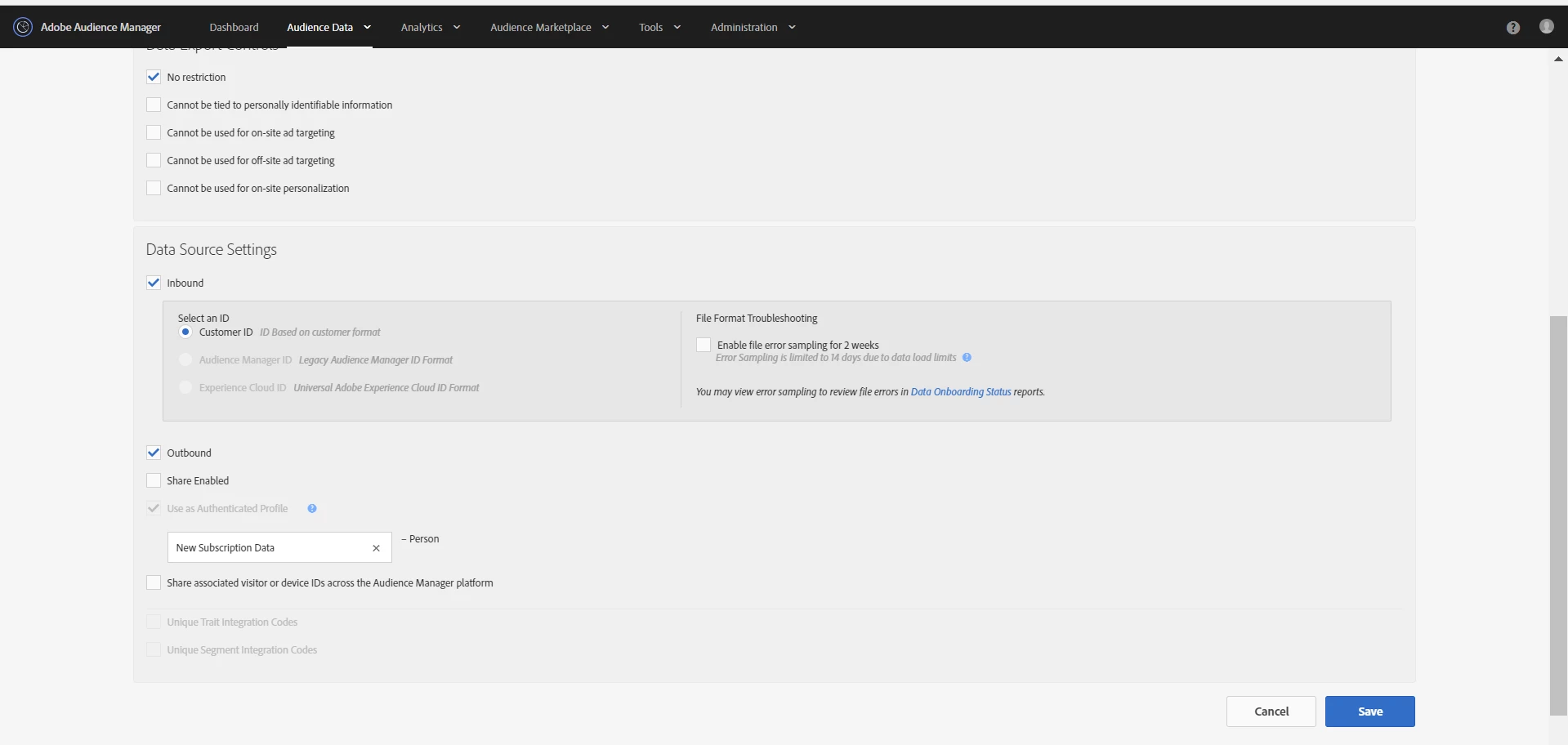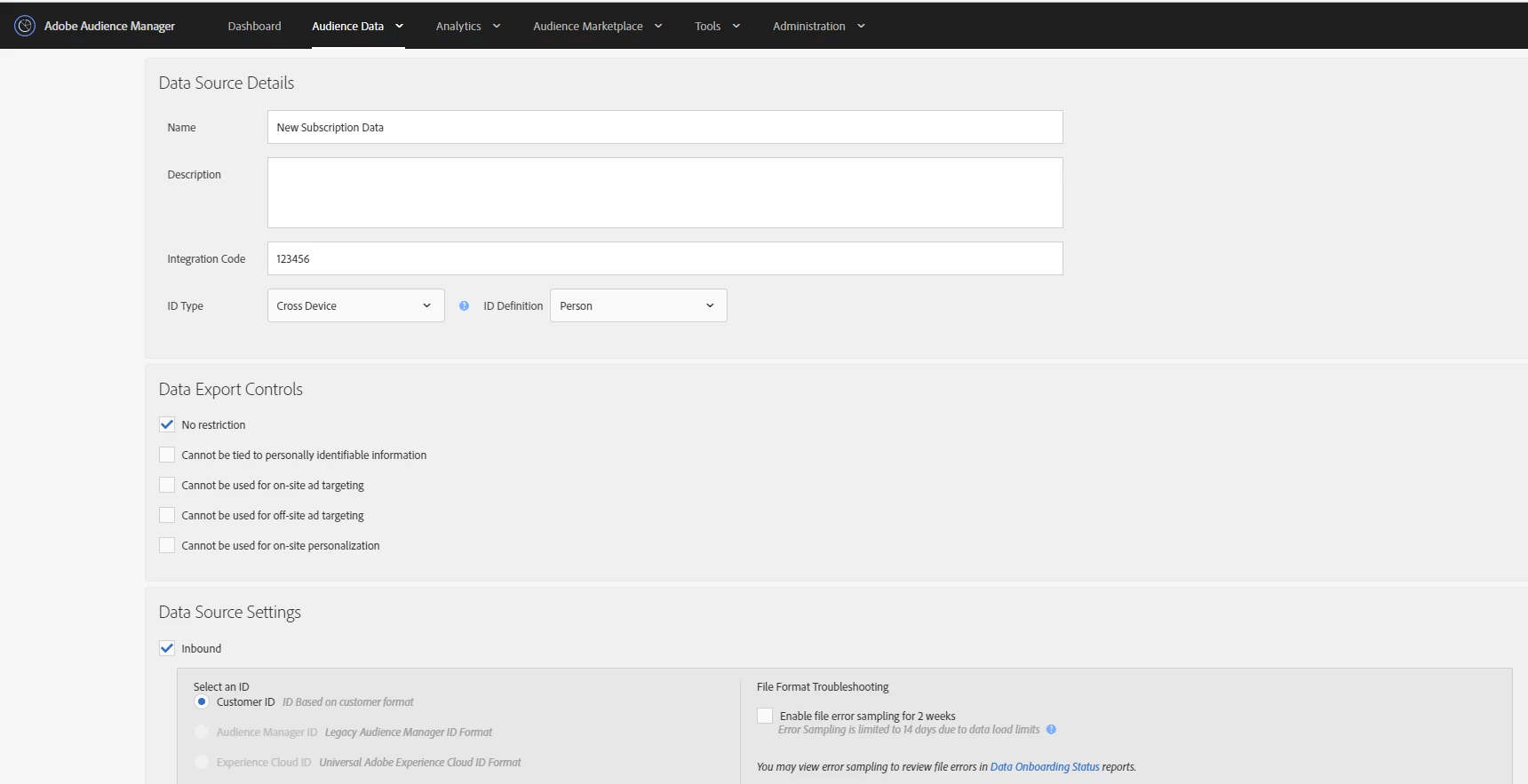 1. The first step in implementing this use-case would be to create the appropriate data source for data onboarding. This can be done by clicking on Audience Data -> Data Source -> Add New and filling in the details accordingly. For the use-case being discussed, the following settings have been enabled. To learn more about creating data sources, click here.
