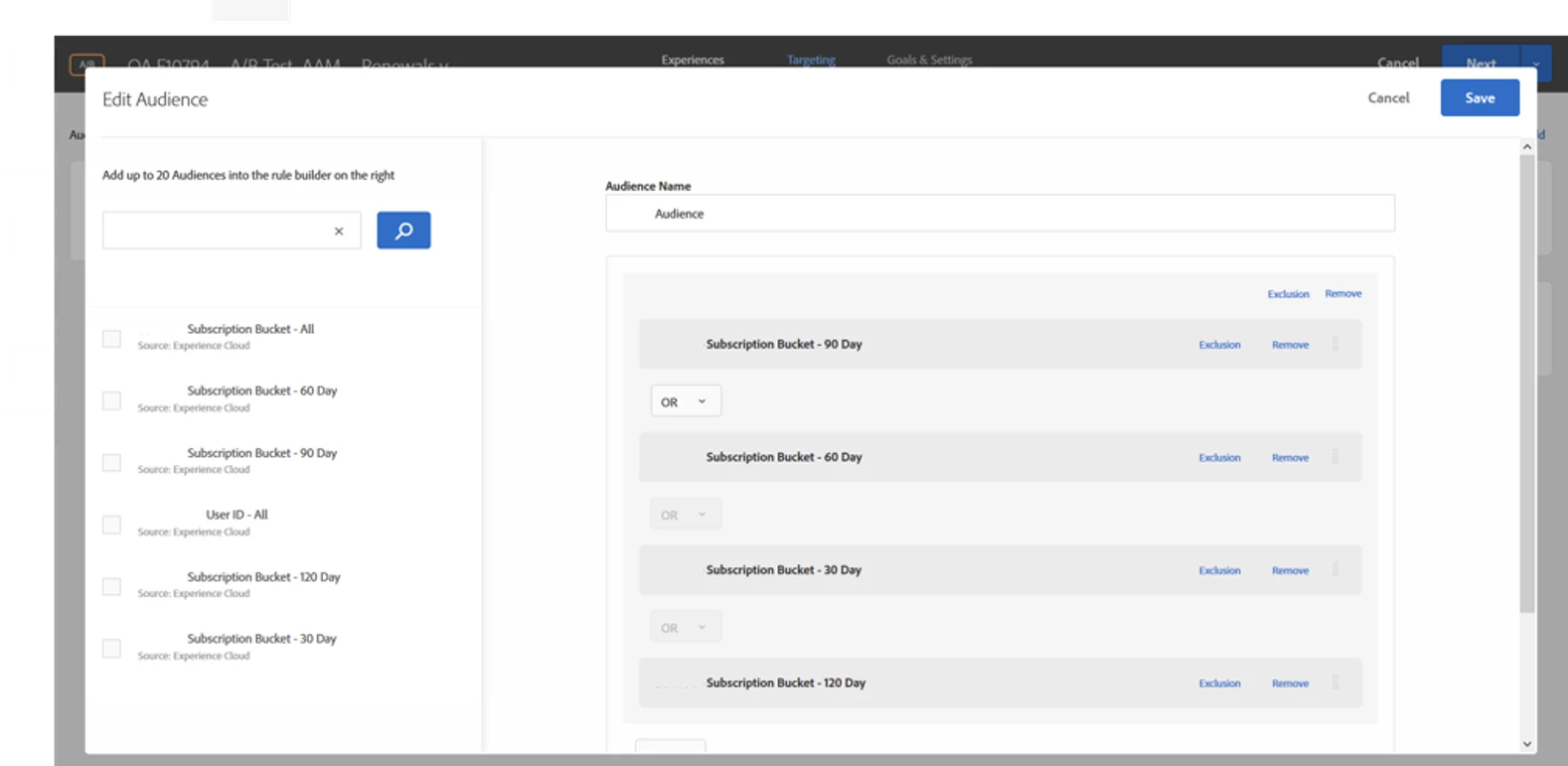 1. Create the relevant experience in Target for the use-case. In our example, the experience is created for renewing the subscription after a number of days (120, 90, 60 and 30). The message will pop up on the website for users who qualify for the experience. To learn more about how to create experiences in Adobe Target, click here.