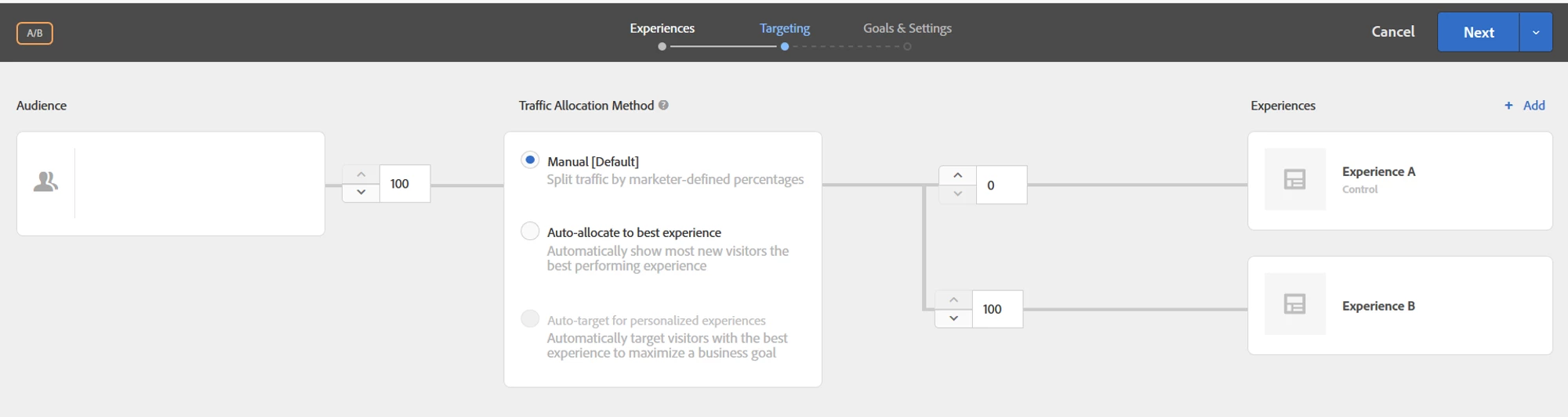 3. Once the audience segments have been identified, set the other parameters for the experience such as the traffic allocation method and the experiences associated with them.