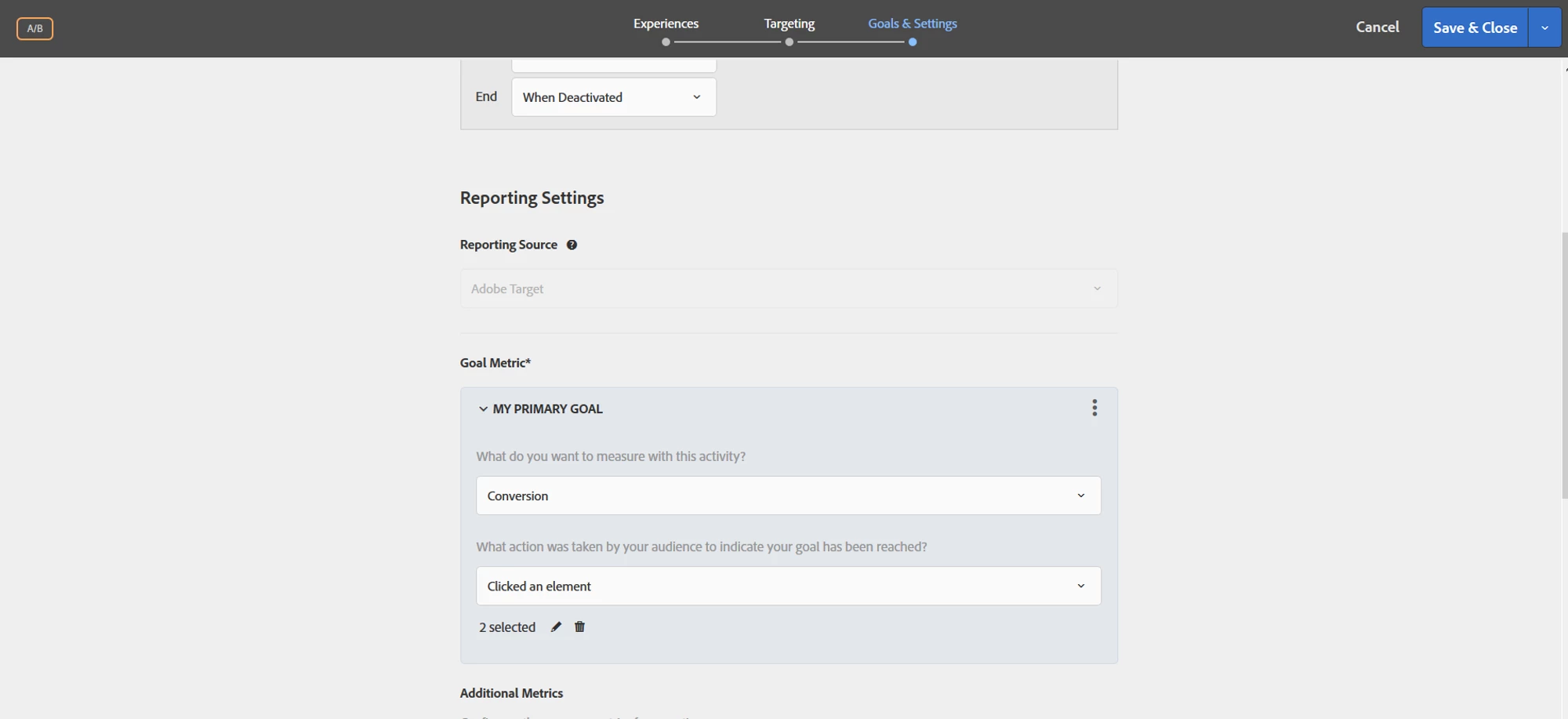 4. Once the experience has been deployed, the results can be tracked through the “Goals and Settings” tab. Under the “Reporting Settings” section, the goal metric can be set which will be used to analyze the performance of the experience. In our example, the primary goal is to track conversions, which is monitored by the number of clicks carried out by the audience.