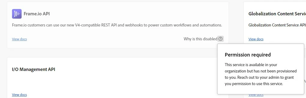 I would like to test the API for Frame.io for a project in our company. For that reason I created an account on the frame.io website and in the developer documentation is written, that I need to create a project on developer.adobe.com and add frame.io there. So I also have an account on adobe. But now I can not add the frame.io API to a project on developer.adobe.com. I have the following message when I try to select it: